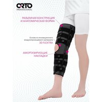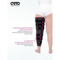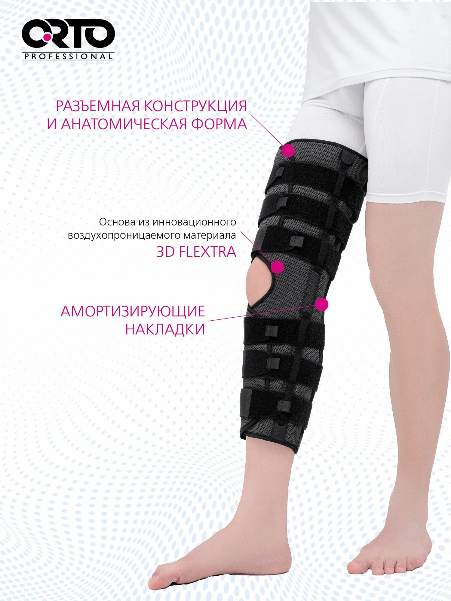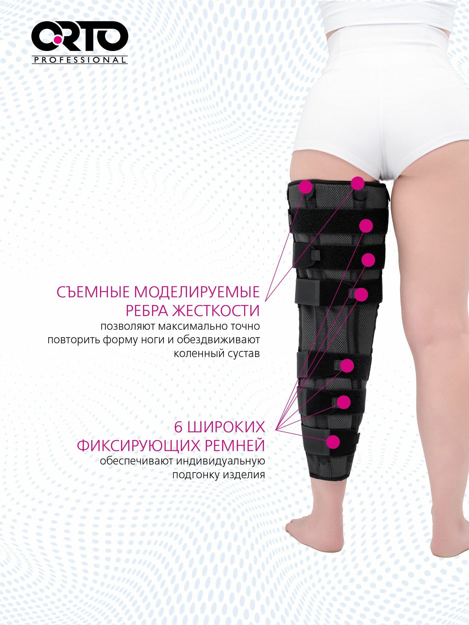 Ортез выполнен в виде разъемного тутора на коленный сустав с основой из нерастяжимого полотна, усилен двумя жесткими профилированными металлическими вставками по задней поверхности, двумя металлическими ребрами жесткости по боковым поверхностям и шестью встречно расположенными эластичными ремнями с застежками. Надежное закрепление всех элементов осуществляется с помощью застежки Velcro.
