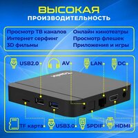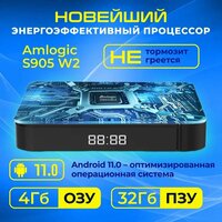 ТВ-приставка с максимальным разрешение 4K UHD Оперативная память 4 ГБ Размер встроенной памяти 32 ГБ Тв приставка Tanix W2 снабжена процессором Amlogic S905W2 с 4 ядрами Cortex-A35 с поддержкой кодека H.265 и AV1. Видеовыход поддерживает 4K с 60 FPS и HDR. Перегрев, свойственный дешевым приставкам, эту модель не коснулся. Корпус у смарт тв приставки постоянно тёплый и с рассеиванием тепла справляется. Коннект: HDMI 2.0, цифровой аудиовыход, Ethernet на 100 Мбит/с, USB 2.0 и USB 2.0. Питание от отдельного блока питания на 5 вольт и 2 ампера с круглым штекером. Тв приставка с модулем Wi-Fi 2,4/5GHz позволяет просматривать контент 4К HDR напрямую с торрентов. Система Android TV 11.0 с удобным и понятным интерфейсом, создана специально для телевизоров. Медиаплеер превратит ваш Телевизор/Проектор/Монитор в полноценный мультимедийный центр с доступом к фильмам, сериалам, кабельным каналам (IPTV), ретро играм