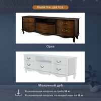 Широкая ТВ-тумба Джульетта прекрасно дополнит интерьер гостиной или спальни в классическом стиле. Предмет мебели аккуратно сглажен по углам. Плавные изгибы деревянных элементов в сочетании с изящными ручками смотрятся очень эстетично.