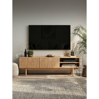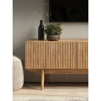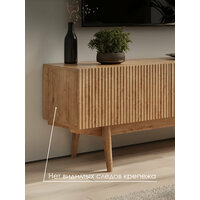 Тумба под телевизор Келли в стиле ретро с длинным прямоугольным корпусом. Это тонкая, но просторная тумба под телевизор с 2 дверцами и открытой нишей. Фасад декорирован деревянными выступами, благодаря которым фактурные элементы выглядят красиво. Ножки изготовлены из массива.