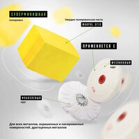Благодаря мелкоабразивному составу, паста маскирует царапины и придает поверхности зеркальный блеск. Продукт не содержит силикон, что делает его безопасным для использования на различных поверхностях.