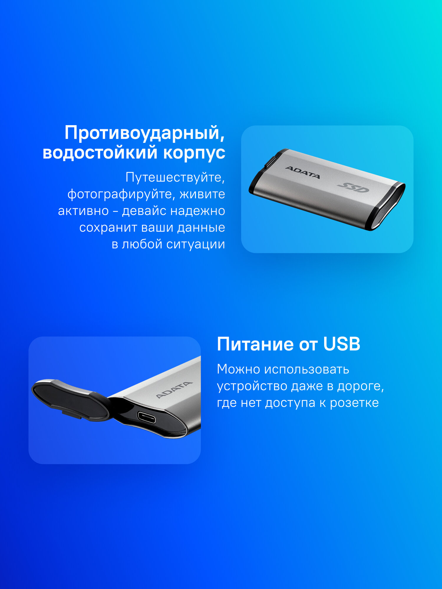 SD810 прошел строгие испытания по стандарту IP68 на водостойкость и пылезащищенность* Накопитель практически не пропускает пыли и выдерживает погружение в воду глубиной до 1 метра в течение 60 минут. SD810 надежно защищен от попадания воды, пыли и падений с высоты, он лучший по уровню защиты IP и скорости передачи данных на рынке защищенных внешних твердотельных накопителей.