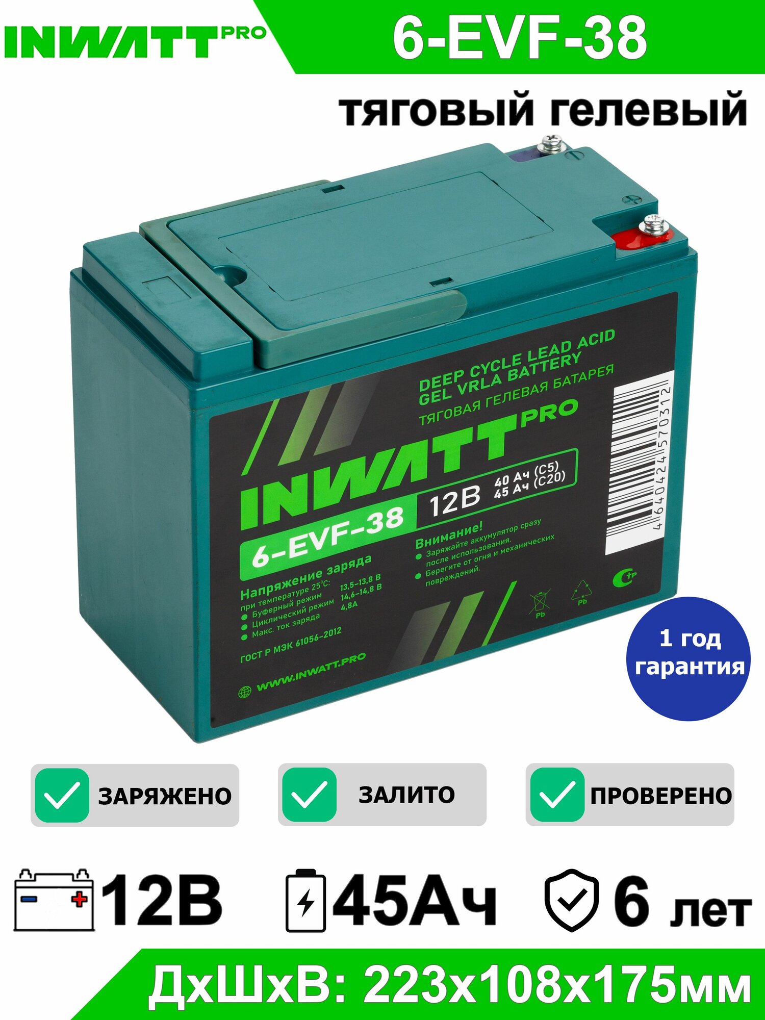 INWATT Pro 6-EVF-38 - необслуживаемая аккумуляторная батарея с системой рекомбинации газов (VRLA) произведенная по технологии AGM. Батареи выполнены по технологии внутреннего формования. В свинцовых пластинах, имеющих большую толщину по сравнению со стандартными аккумуляторами, используется экологичный запатентованный сплав без кадмия и мышьяка. Плотный сепаратор из углеволокна пропитан электролитом, изготовленным по технологии NANO GEL. Электролит находится в сгущенном состоянии, не даёт утечек и не требует долива воды на протяжении всего срока эксплуатации. Батареи Rutrike серии EVF имеют высокую производительность, способны выдерживать высокие токи разряда, работают в широком диапазоне рабочих температур. Аккумуляторы INWATT Pro предназначены для ежедневной интенсивной эксплуатации в самом широком диапазоне сфер применения!