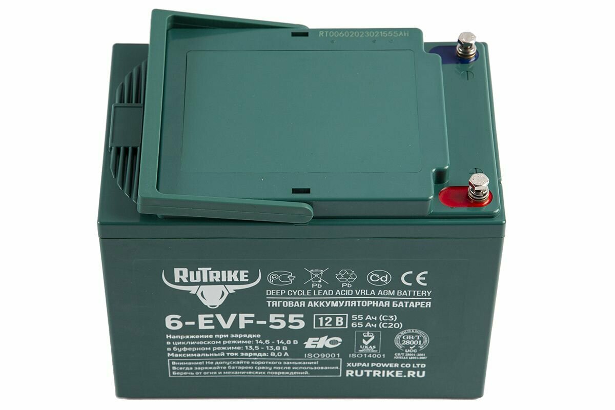 Аккумулятор RuTrike 6-EVF-55 — специальная тяговая батарея для тяжёлой работы. Количество полных циклов 80% разряда/заряда превышает 700. Предназначен для глубокого разряда (Deep Cycle). Предоставляем безусловную гарантию 12 месяцев. Серия тяговых батарей EVF использует передовые мировые технологии чтобы обеспечить аккумуляторам длительный срок службы, большую разрядную способность, высокую надёжность, безопасность и экологичность.