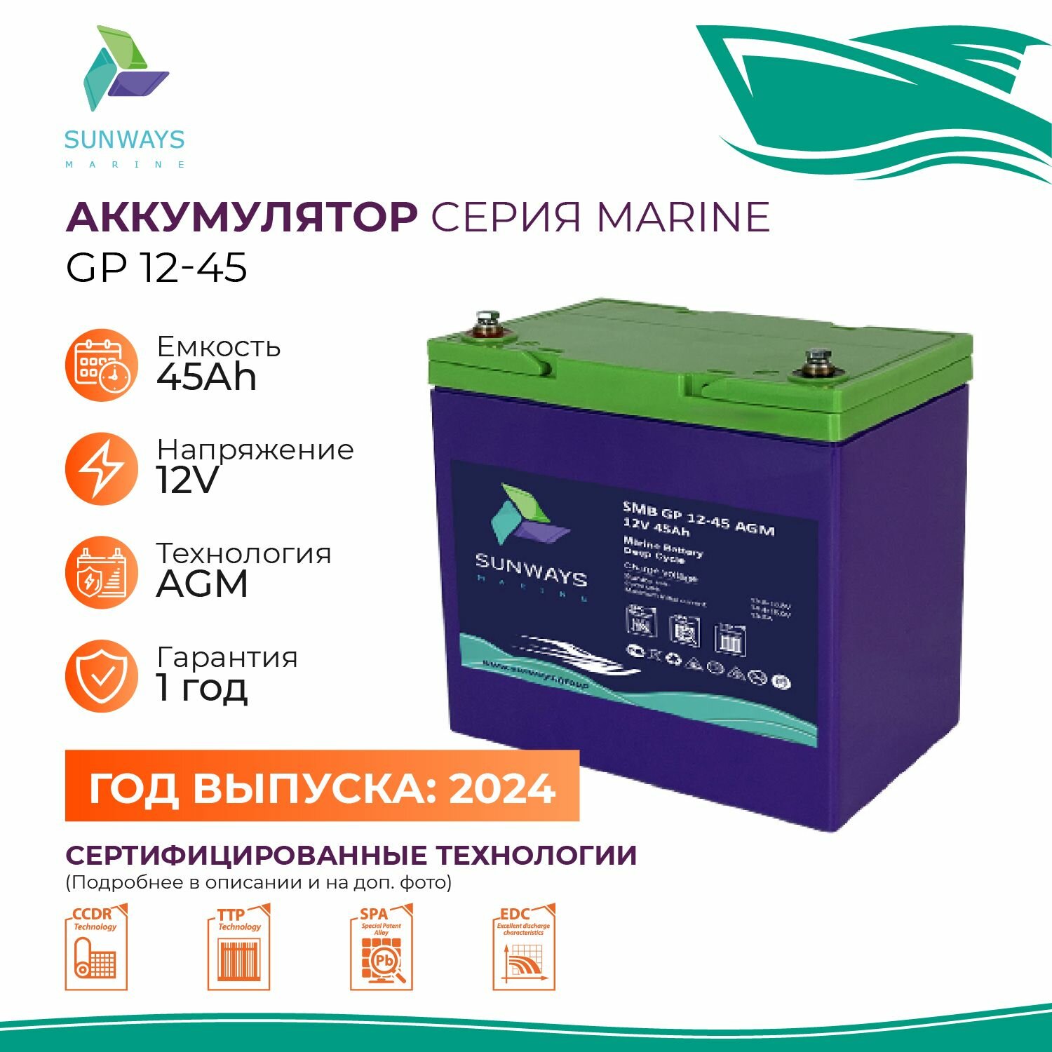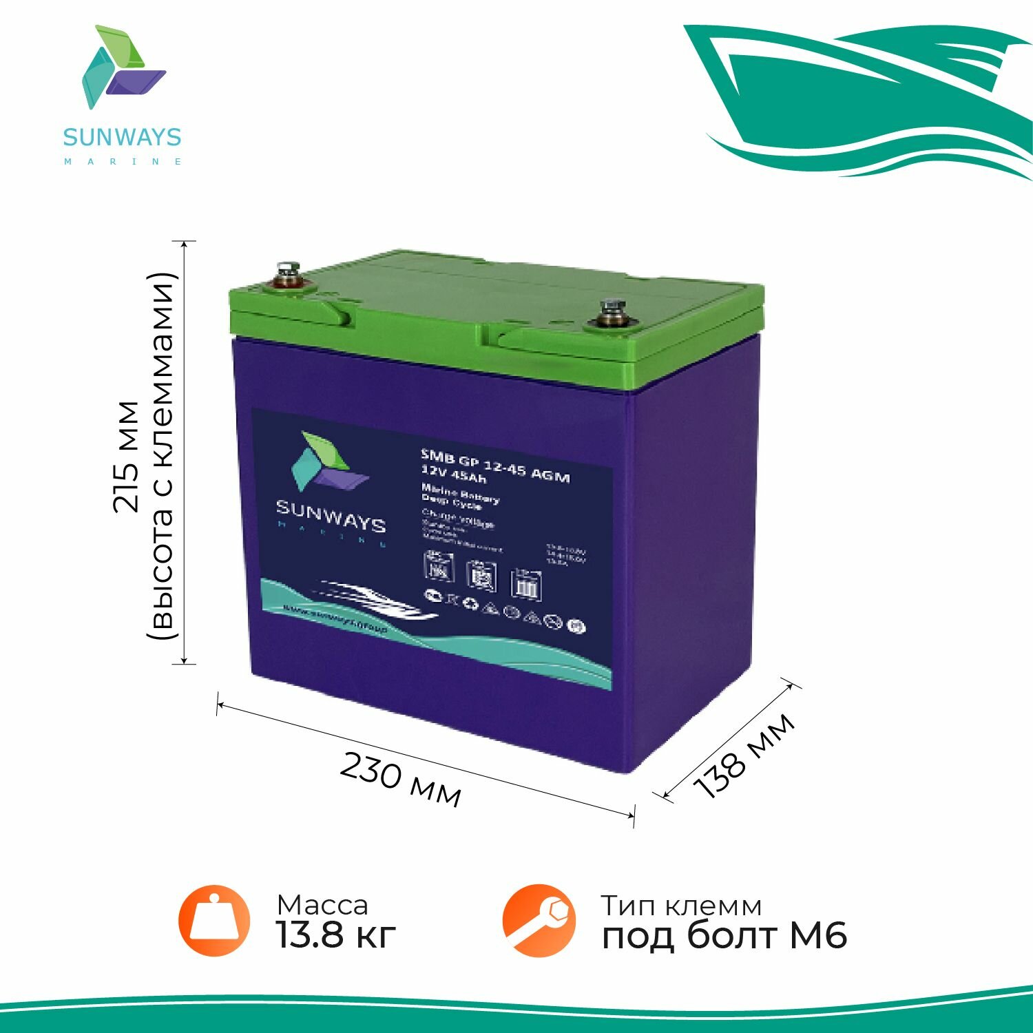 Тяговый аккумулятор Sunways Marine SMB GP 12В 45Ач AGM аккумулятор для лодки, мотора, 1 шт.: сравнение цен, характеристики, фото, актуальное наличие и цены.