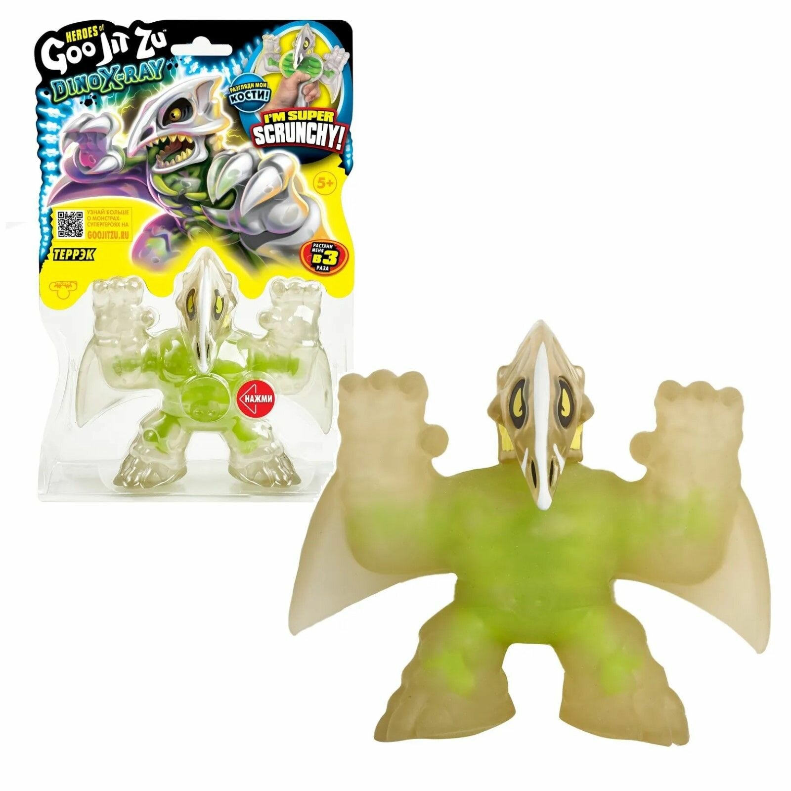 Тянущаяся фигурка Террэк Дино Икс-Рэй Гуджитсу приятна на ощупь, растягивается в 3 раза. Игрушка высотой 12 см с зелеными костями внутри наполнена гелем с пузырьками.