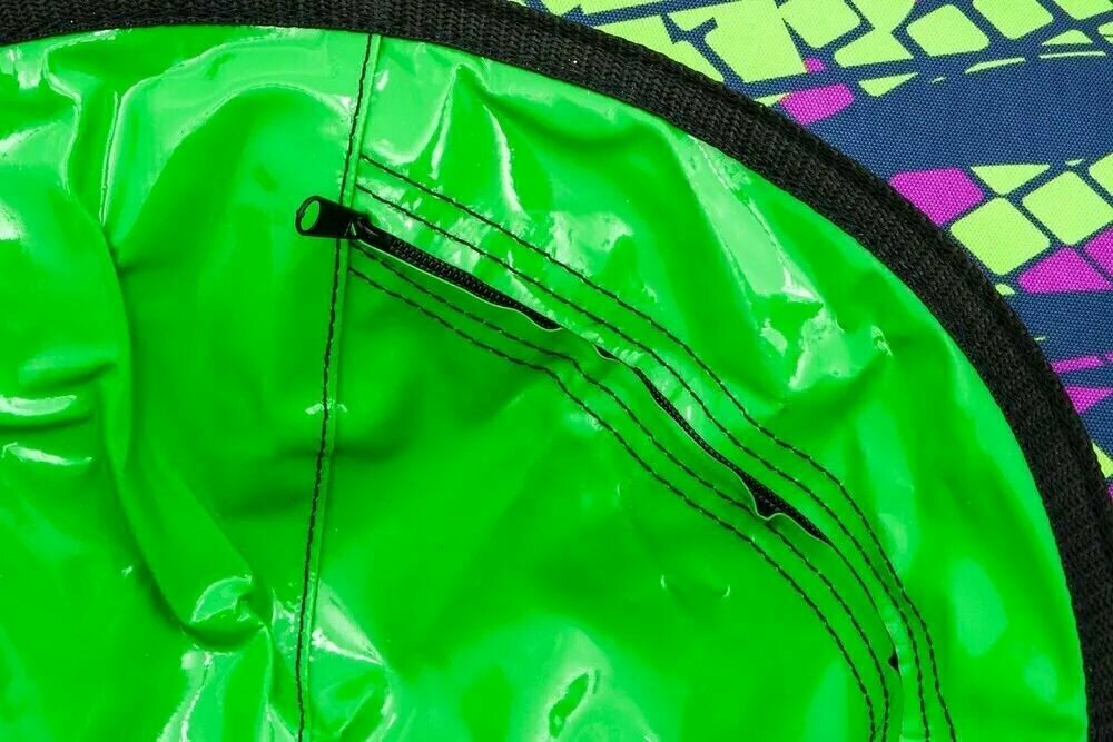 диаметр чехла 93 см; верх – ткань OXFORD 500D с ярким принтом, дно – автотент ПВХ 610; устойчивый к морозам материал до -28ºС; защитный внутренний клапан с потайной молнией