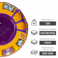 Дно тюбинга изготовлено из тентовой ткани плотностью 550–650 г/м², что гарантирует долгий срок службы и обеспечивает отличное скольжение. Снаряд оснащён безопасными ручками и молнией для быстрого доступа к камере. Имеет закрытую сердцевину, что исключает попадание снега внутрь. Для тюбинга подойдёт камера 15 дюймов. Предназначен для детей от 12 лет.