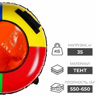 Дно тюбинга изготовлено из тентовой ткани плотностью 550-650 г/м², что гарантирует долгий срок службы и обеспечивает отличное скольжение. Снаряд оснащён безопасными ручками и молнией для быстрого доступа к камере. Имеет закрытую сердцевину, что исключает попадание снега внутрь. Для тюбинга подойдёт камера 12 дюймов. Предназначен для детей от 12 лет.