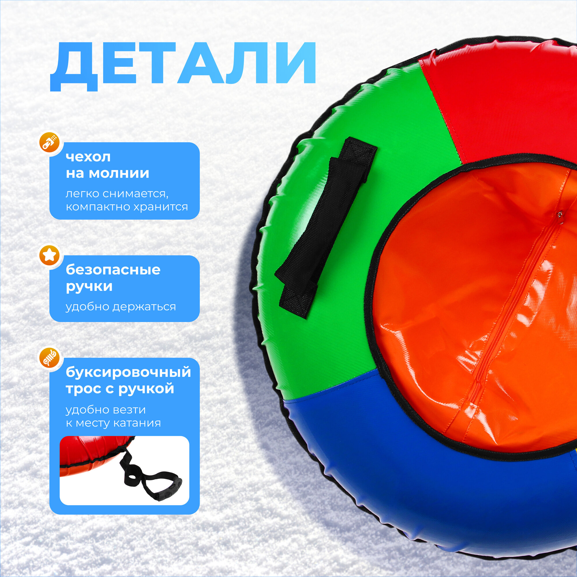 Дно тюбинга изготовлено из тентовой ткани плотностью 550-650 г/м², что гарантирует долгий срок службы и обеспечивает отличное скольжение. Снаряд оснащён безопасными ручками и молнией для быстрого доступа к камере. Имеет закрытую сердцевину, что исключает попадание снега внутрь. Для тюбинга подойдёт камера 12 дюймов. Предназначен для детей от 12 лет.