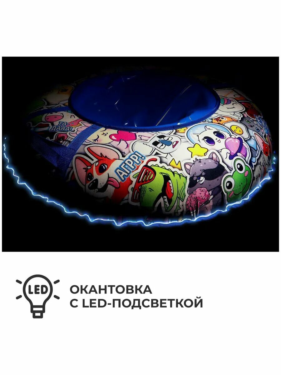 Дно тюбинга изготовлено из тентовой ткани плотностью 550–650 г/м², что гарантирует долгий срок службы и обеспечивает отличное скольжение. Снаряд оснащён безопасными ручками и молнией для быстрого доступа к камере. Имеет закрытую сердцевину, что исключает попадание снега внутрь. Для тюбинга подойдёт камера 15 дюймов. Предназначен для детей от 12 лет.