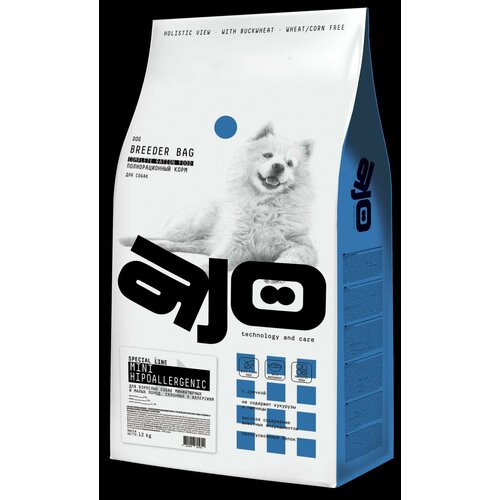 AJO Mini Hypoallergenic Сухой полнорационный корм с гречкой для взрослых собак миниатюрных и малых пород, склонных к аллергиям 12 кг. Легкоусвояемые белки, отсутствие глютена и комплекс про- и пребиотиков для профилактики проявлений аллергии и нормализации пищеварения.