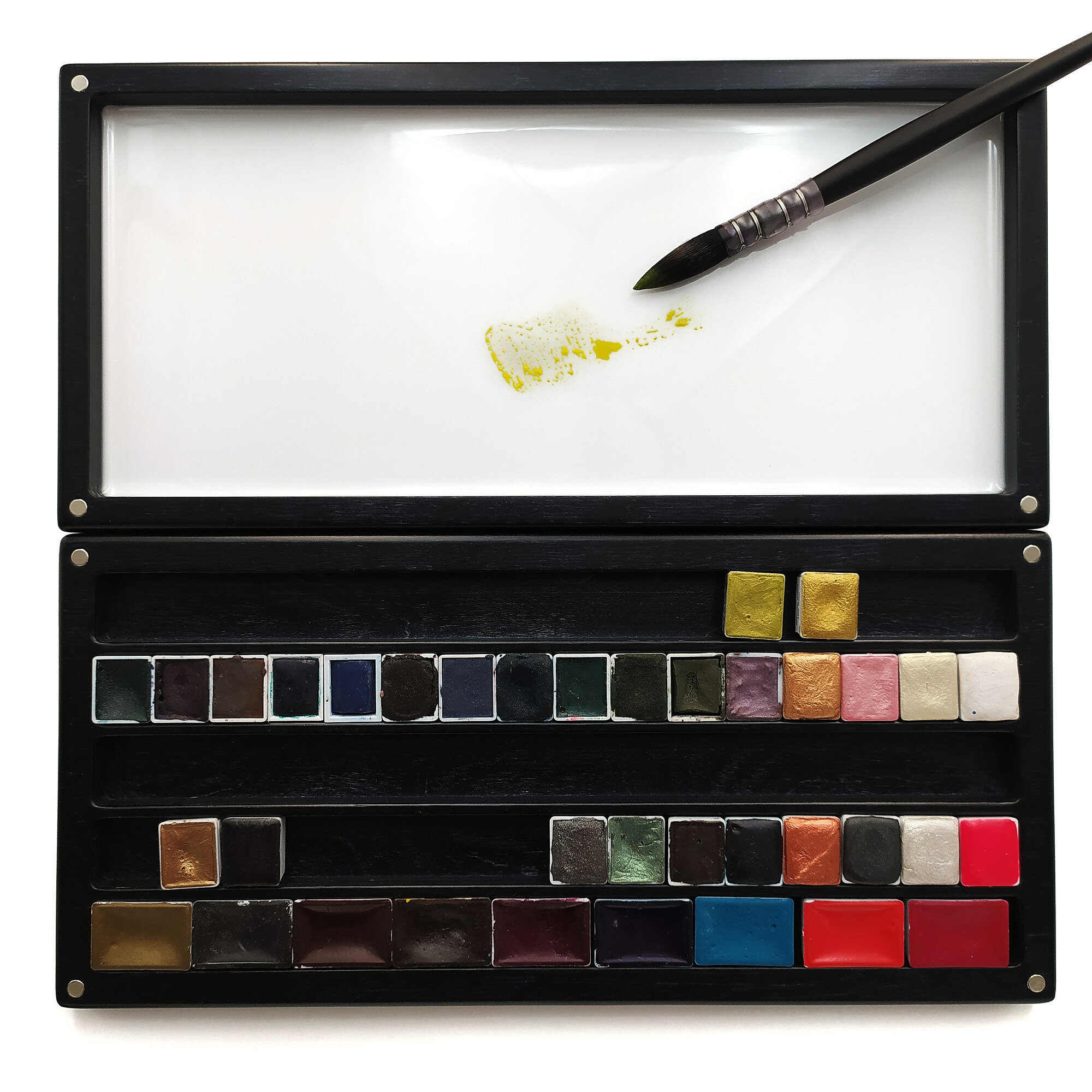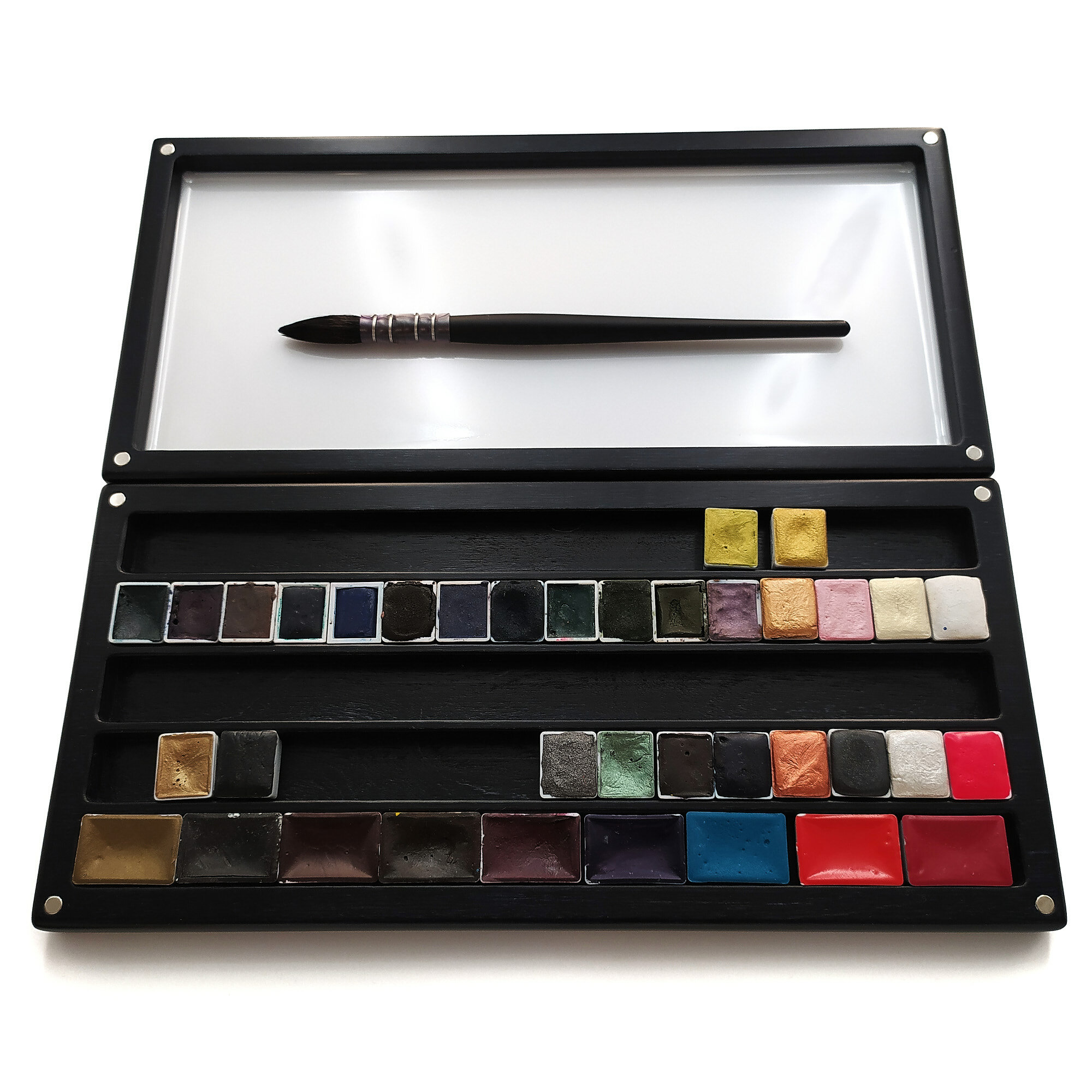 Стильный и универсальный черный пенал под акварельные краски любых производителей и размеров, будь то полукюветы или кюветы.