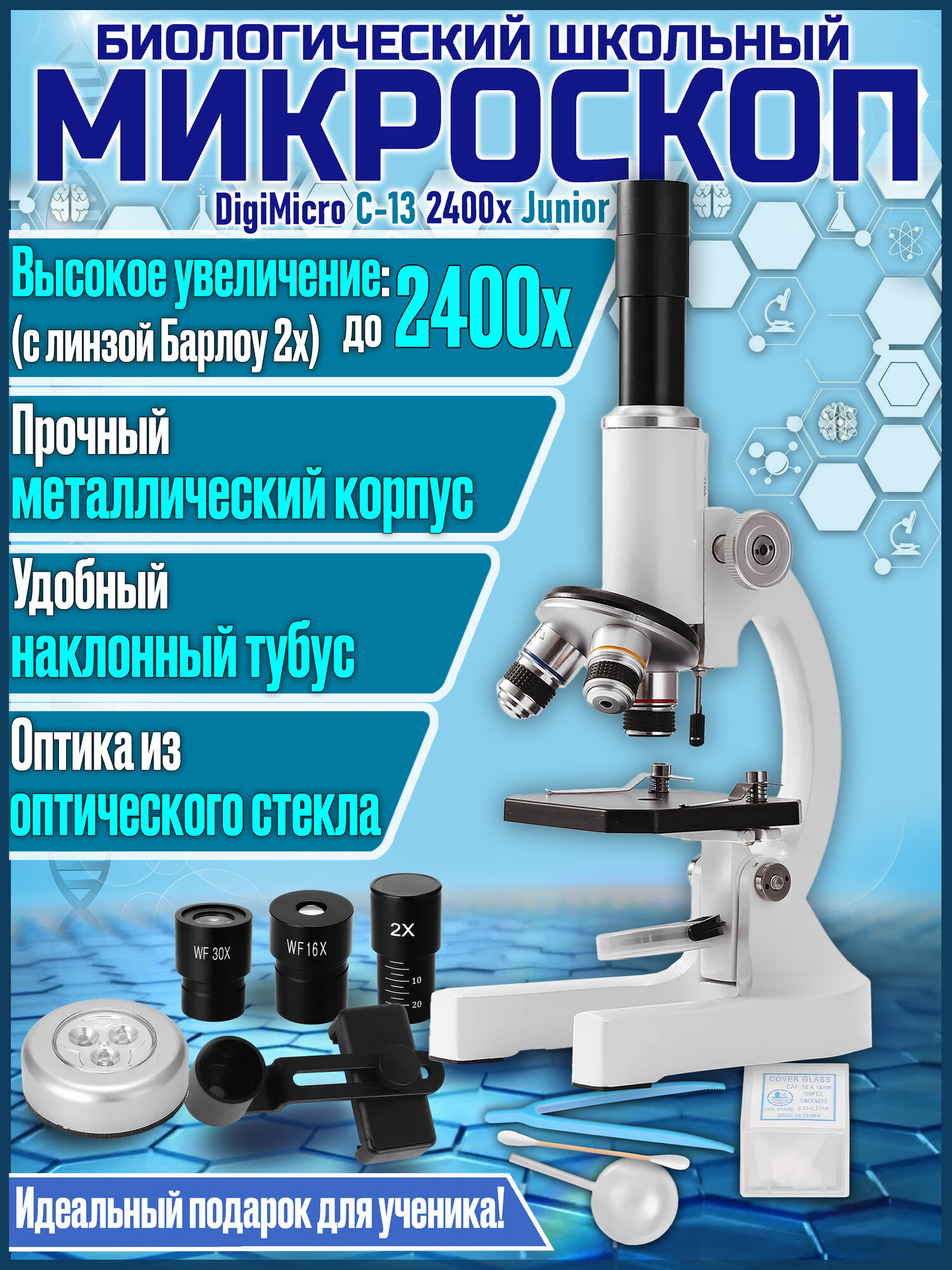 Три объектива, два окуляра и удваивающая линза Барлоу предоставляют возможность менять увеличение в пределах 64-2400 крат, что очень не плохо для учебной модели. Предусмотрена возможность установки видеоокуляра (в комплект не входит) или адаптера для смартфона (входит в комплект), что открывает широкие возможности не только для просмотра изображения с биологического микроскопа DigiMicro Erudit С-13 2400x на экране монитора или телевизора, но и прямой трансляции результатов в интернете и фотографирования своих исследований.