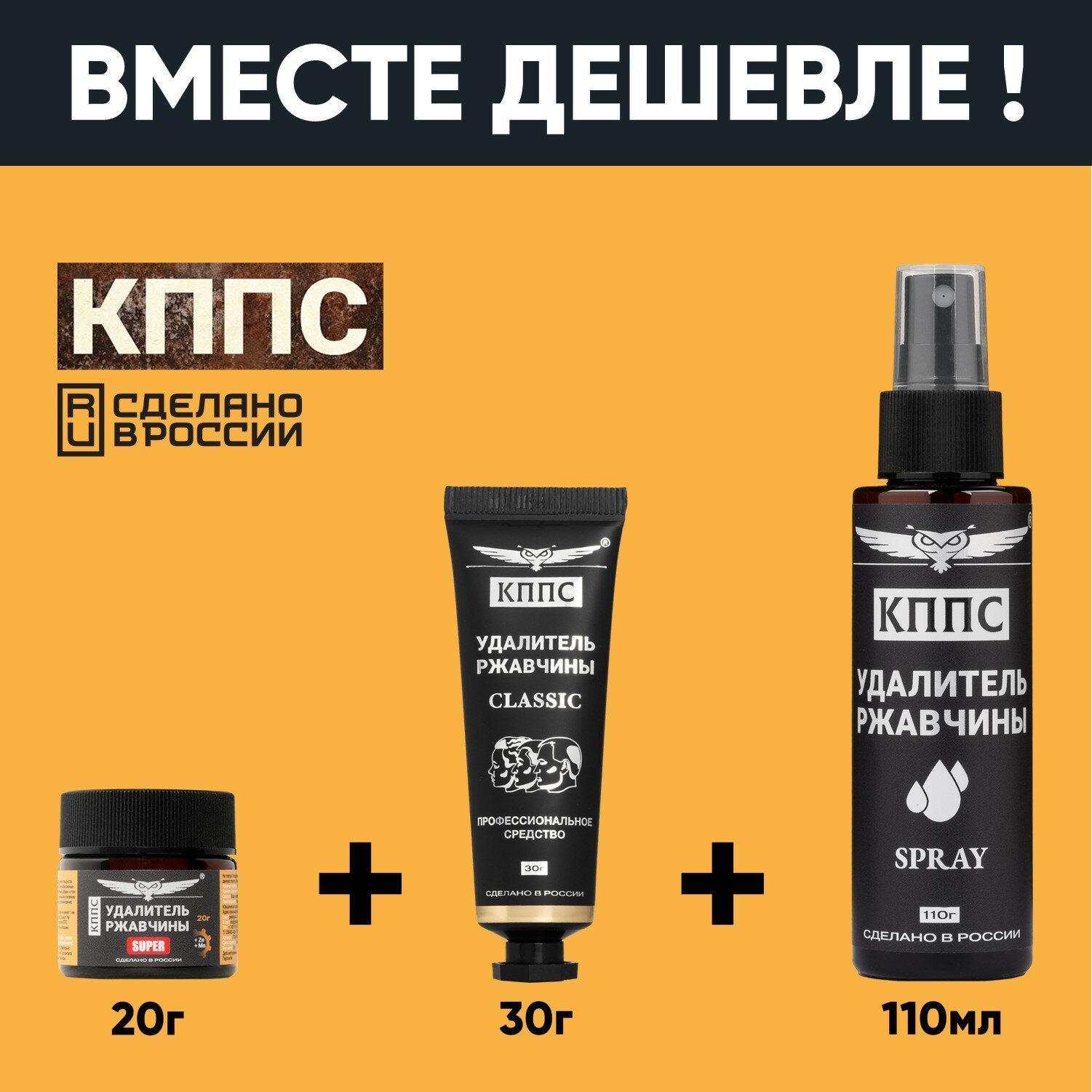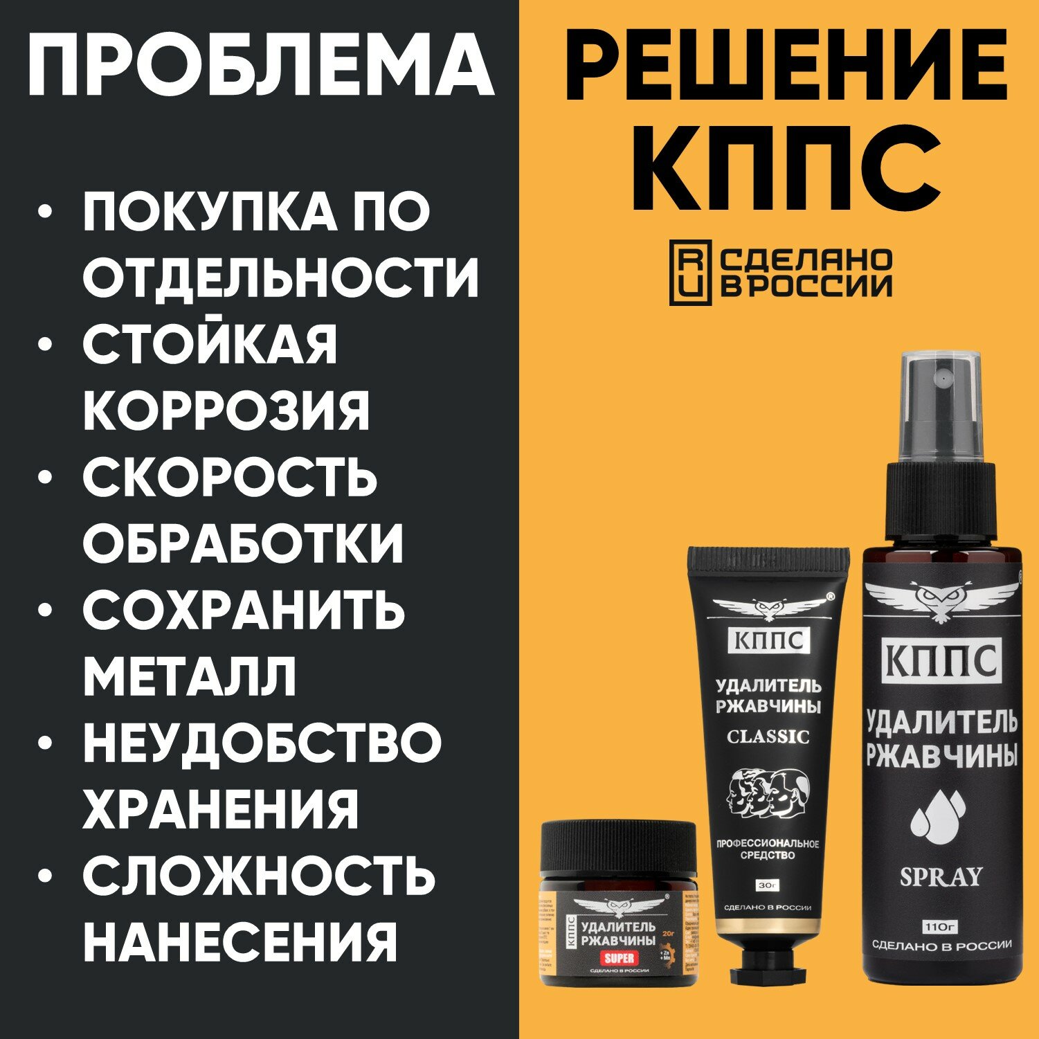 - Удалитель ржавчины кппс CLASSIC(30г) – профессиональное средство для полного удаления продуктов коррозии в форме геля. Антикор эффективно справляется с растворением ржавчины глубиной до 3х мм. Время обработки поверхности составляет не более 30 минут. Упаковка позволяет дозированно использовать продукт, что способствует низкому расходу удалителя ржавчины, а также защищает состав от высыхания при хранении. Антикоррозионное средство наносится равномерно и держится на всех наклонных поверхностях, что обеспечивает качественное очищение.