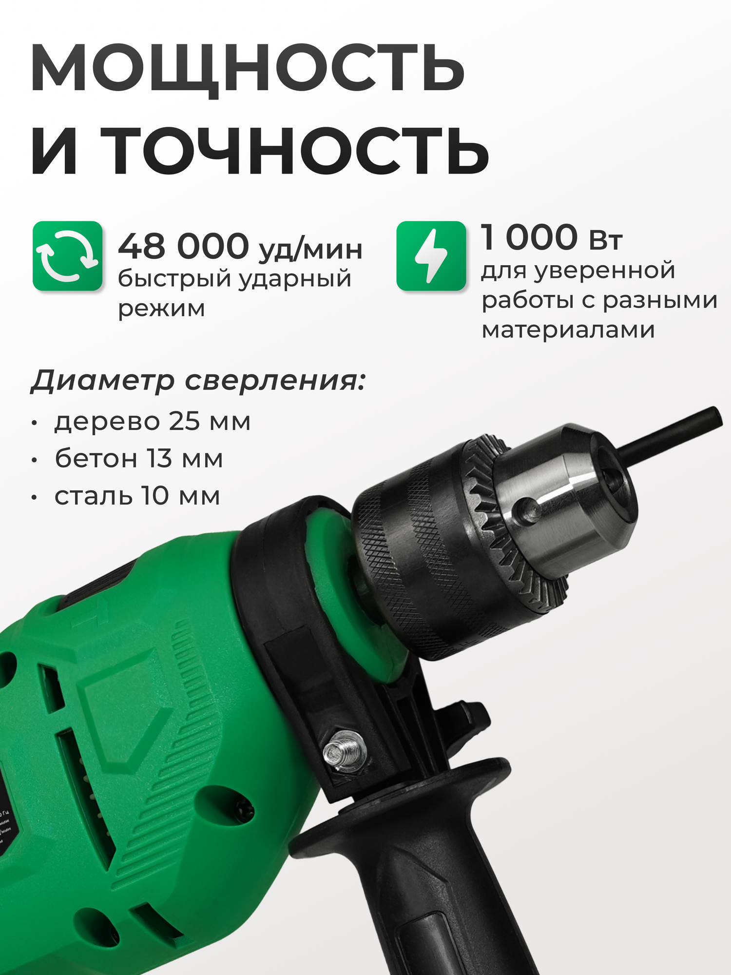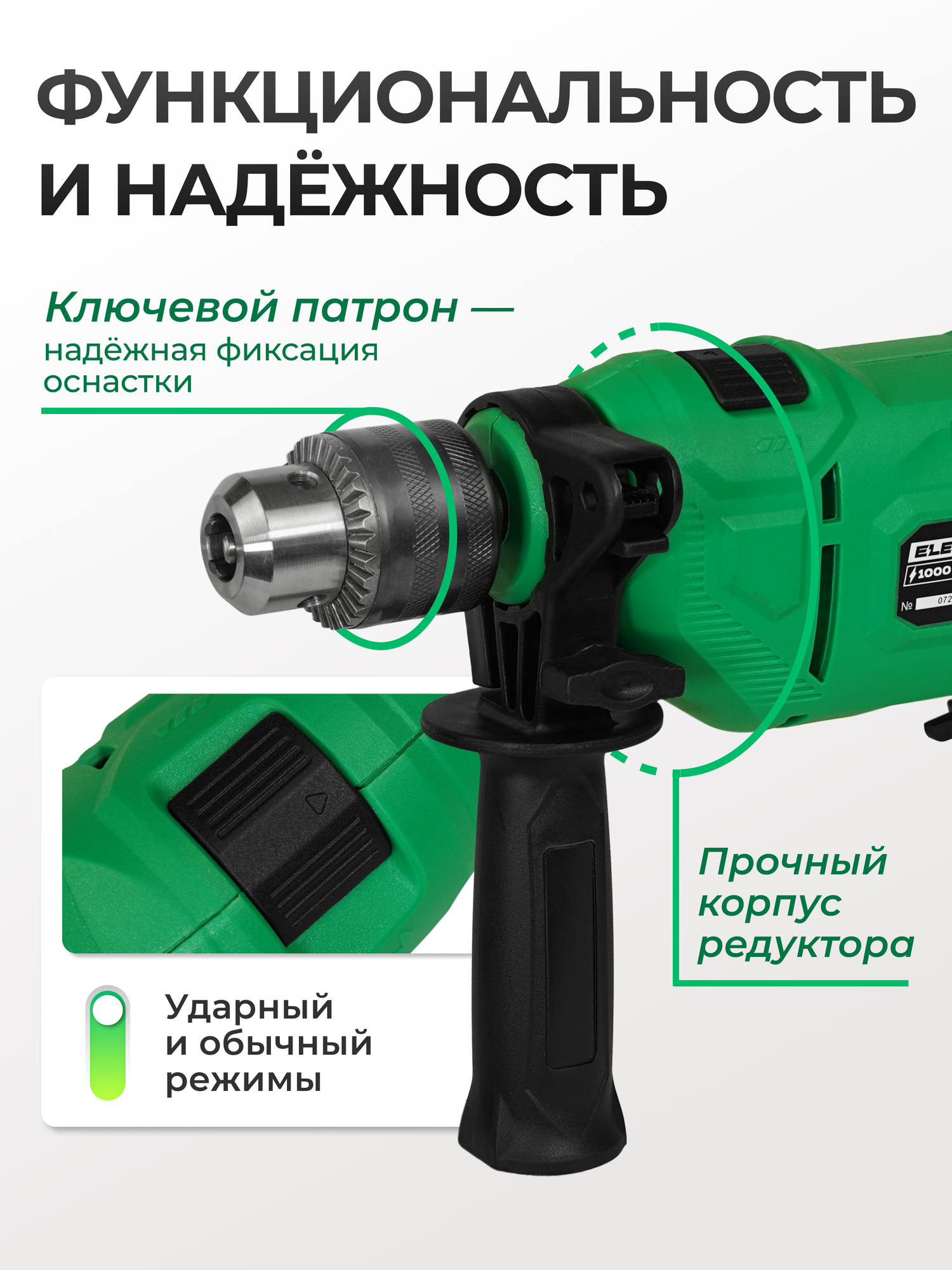Ударная дрель Electrolite ID 1000, ключевой патрон, дополнительная рукоятка, ограничитель глубины: сравнение цен, характеристики, фото, актуальное наличие и цены.