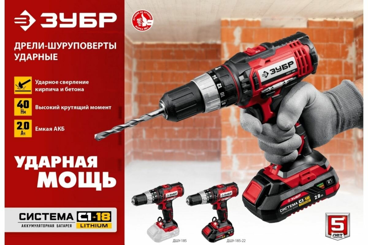 Ударная дрель-шуруповерт ЗУБР ДШУ-185-22 используется для сверления, в том числе ударного, отверстий в различных материалах (при установке сверла) и для монтажа/демонтажа резьбовых соединений (при установке соответствующих бит и головок).