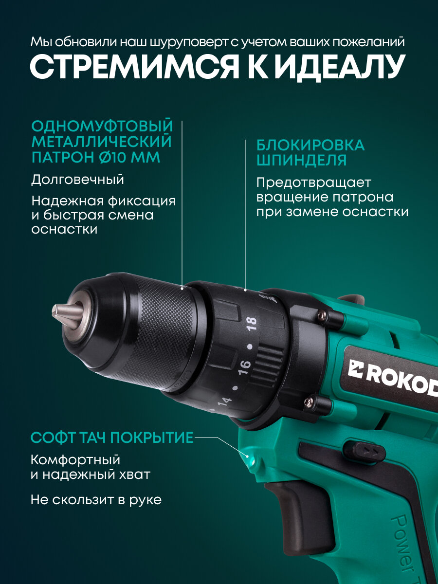 Шуруповерт аккумуляторный 18В Rokodil Twist 2 Pro Impact (2 АКБ) с ударным режимом – ваш неубиваемый помощник в ремонте, отделке и строительстве. Прибор выдержит самые интенсивные нагрузки и справится со сверлением любых материалов, даже если вы работаете со сталью толщиной 20 мм и сверлом 10 мм. Для продуктивной и комфортной работы с бетоном и кирпичом предусмотрен ударный режим, он также пригодится, чтобы сорвать плотно затянутые крепежи или наоборот – затянуть винты потуже. Дрель-шуруповерт оснащена одним из лучших двигателей RS550VC-6435F, который выдает реальные 48 нМ крутящего момента. Надежность и долговечность обеспечивают металлические шестерни редуктора, устойчивые к износу. Функция блокировки шпинделя освобождает от необходимости придерживать патрон, чтобы ослабить или затянуть его, также позволяет легко докрутить крепеж вручную, когда есть риск загнать его глубже необходимого.