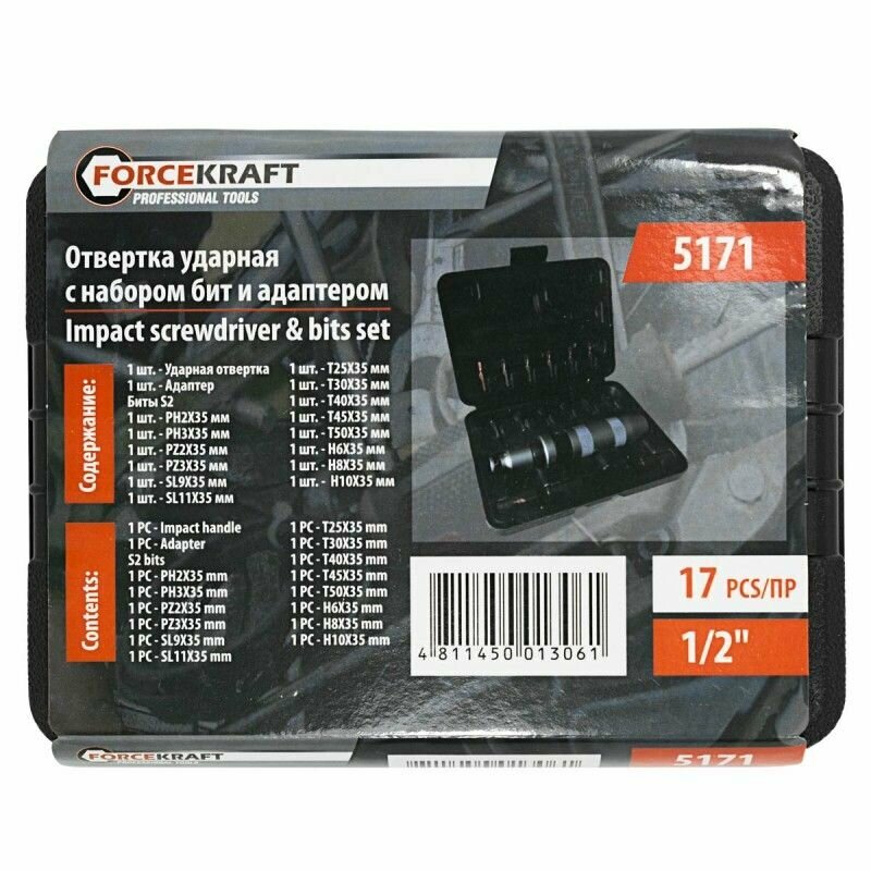 Купить Forcekraft Отвертка ударная с набором бит и адаптерами, 17 предметов 1/2″ в кейсе FK-5171(47289) с доставкой по всей России.