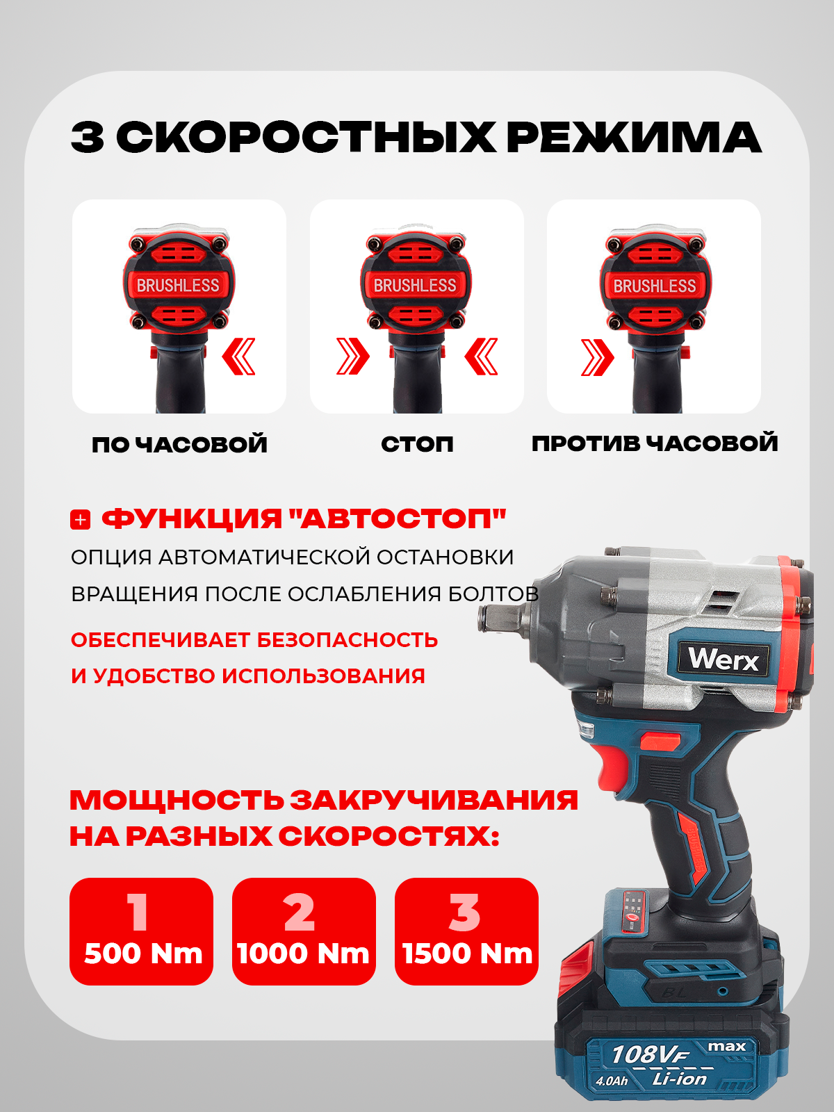 Мощный аккумуляторный ударный гайковерт с набором головок 1500NM – идеальный инструмент для выполнения различных задач в области строительства и ремонта. Этот болтоверт создан для тех, кто ценит надежность и отличную производительность. Благодаря своим заявленным характеристикам, гайковерт аккумуляторный ударный станет незаменимым помощником как для профессионалов, так и для любителей DIY-проектов. В комплект входит кейс, в котором можно удобно переносить и надёжно хранить гайковерт. Винтоверт аккумуляторный обладает высокой мощностью, что позволяет ему справляться с самыми сложными задачами, включая закручивание и откручивание крепежа с высоким крутящим моментом. Ударный механизм обеспечивает эффективную подачу усилия, позволяя работать с металлическими и пластиковыми соединениями, а также с различными видами гаек и болтов. С таким гайковертом вы сможете существенно сократить время на выполнение работы, добиваясь отличных результатов с минимальными усилиями. Аккумуляторный гайковерт изготовлен с учетом современных требований к эргономике. Он обладает удобной формой и лёгким весом, что делает его простым в использовании даже в труднодоступных местах. Прорезиненная рукоятка обеспечивает надежный хват, что позволяет работать без усталости в течение длительного времени. Кроме того, данный гайковерт ударный оснащен высоким качеством сборки и элементами безопасности, которые обеспечивают его долговечность и надежность. Винтоверт подходит для работы в различных условиях – как в помещении, так и на улице. С его помощью вы сможете легко справляться с задачами в гараже, на даче или на стройплощадке. Аккумуляторный ударный гайковерт станет отличным выбором для тех, кто ищет мощный и функциональный инструмент. Не упустите возможность улучшить свой арсенал с помощью этого надежного помощника. Приятных покупок.