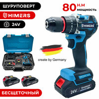 Купить Ударный бесщеточный шуруповерт HIMERS DF80B-BL аккумуляторный 24V, 2 АКБ по 3 А. ч, 80 Н. м, 13мм патрон, кейс с доставкой по всей России.