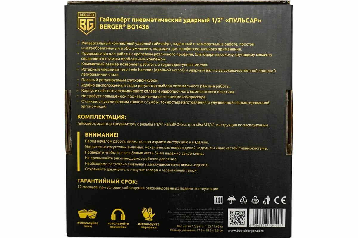 Купить Ударный пневматический гайковерт Berger BG пульсар 1/2″, 680 Нм BG1436 с доставкой по всей России. Ударный пневматический гайковерт Berger BG пульсар 1/2″, 680 Нм BG1436: сравнение цен, характеристики, фото, актуальное наличие и цены.