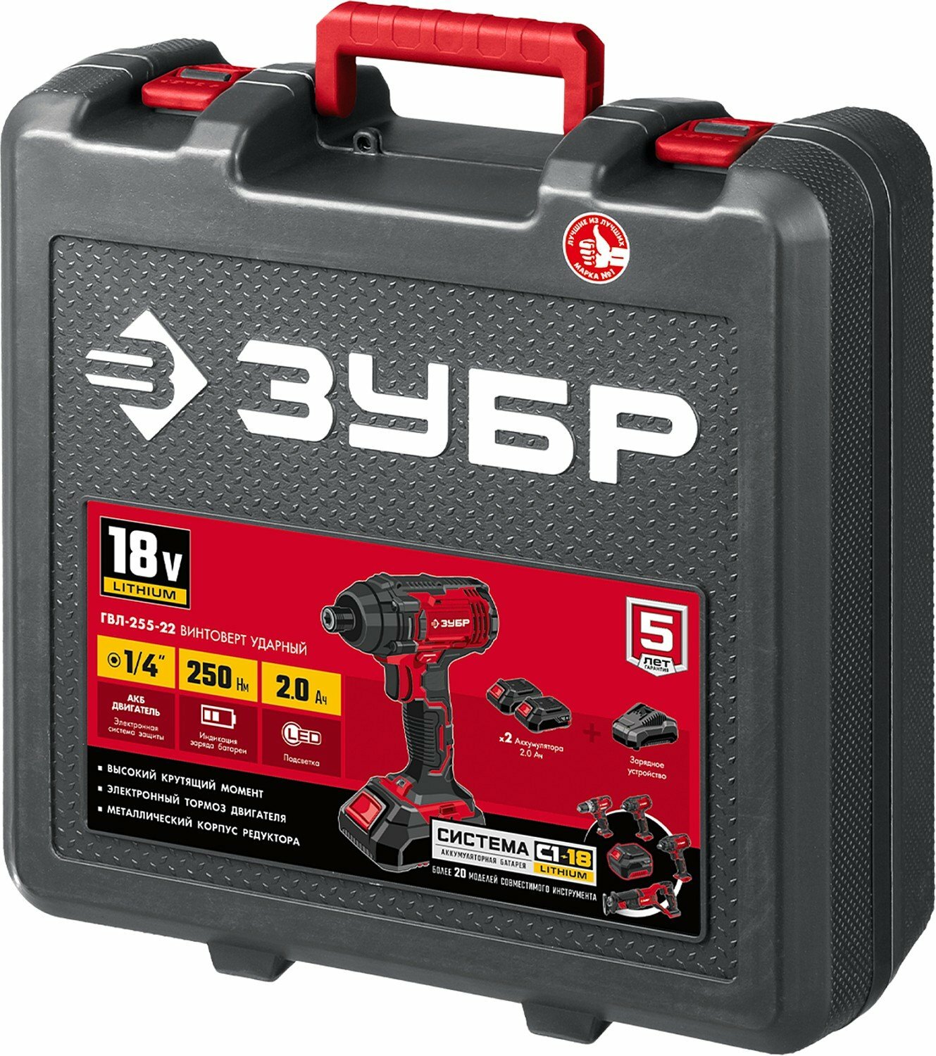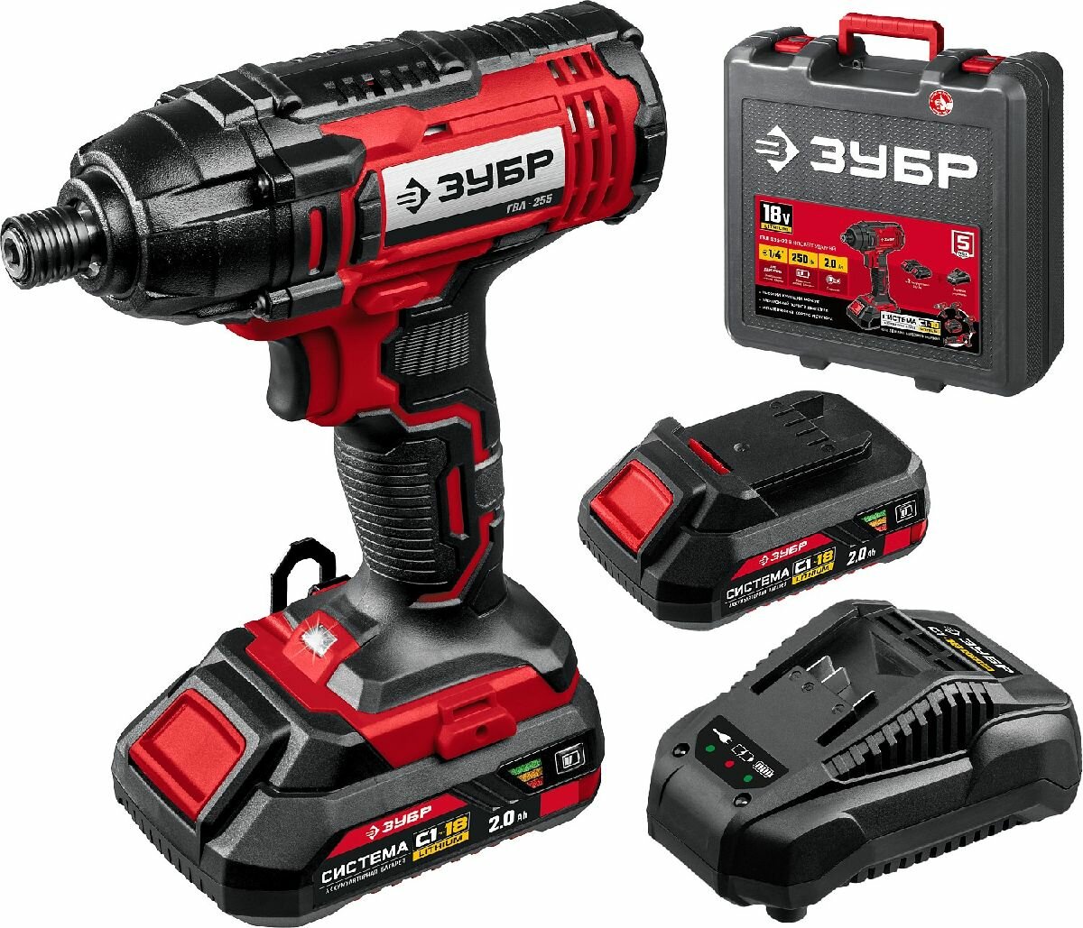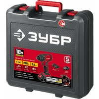 Ударный винтоверт ЗУБР 18В 2 аккумулятора 2Ач крутящий момент 250 Нм частота вращения 0-2800 об/мин ударная функция 0-3600 уд/мин