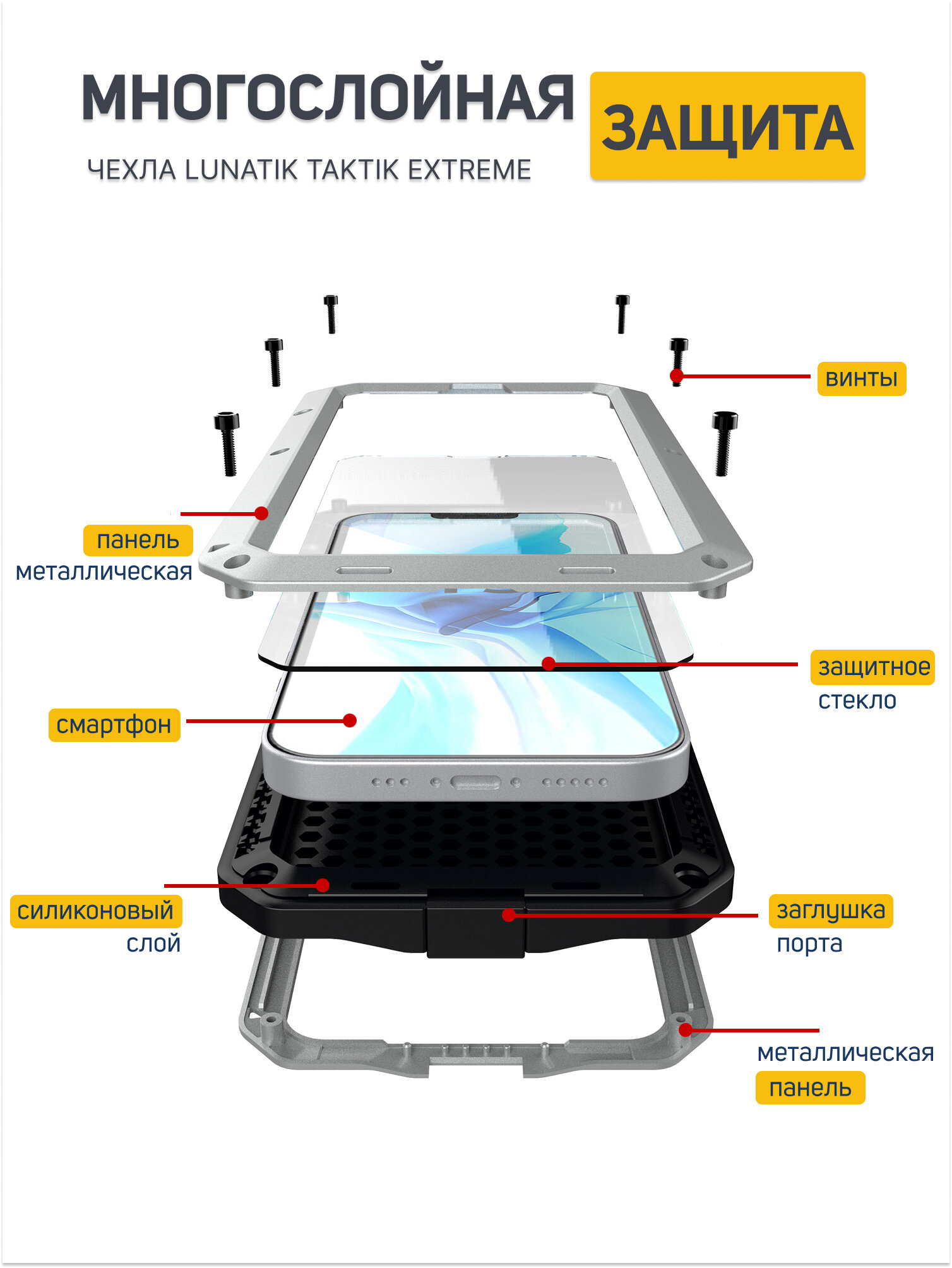 Lunatik Taktik Extreme предоставит вашему iPhone непревзойденную защиту, поднимет планку еще выше среди лучших защитных чехлов. Чехол на iPhone 13 Pro Max отличается не только стильным дизайном, но и надежной защитой вашего смартфона от повреждений. Выбирая этот кейс, вы получаете защиту вашего смартфона от ударов, падений, попадания воды и пыли, а также сохраняете целостность экрана и камеры. Противоударная сэндвич-система Lunatik включает в себя инновационный силиконовый слой Impact Hex Truss, располагающийся между двумя алюминиевыми панелями. Сэндвич-система надежно закреплена с помощью шести болтов-шестигранников. Внутри передней панели находится уплотнительная прокладка для защиты от попадания влаги внутрь корпуса. Динамик закрыт двумя мембранами, порт зарядки – герметичной заглушкой, экран смартфона – защитным стеклом Gorilla Glass последнего поколения. Корпус чехла айфон 13 про макс плотно прилегает к телефону, обеспечивая полную защиту всего вашего устройства. Вы можете не беспокоиться о попадании пыли и влаги, защита этого чехла герметична и достаточно прочна, чтобы вы могли использовать свой телефон apple даже в снег или при дожде. Кейс на iphone 13 pro max полностью совместим с беспроводной зарядкой и FaceID. Если вы хотите обеспечить надежную защиту и сохранить полную функциональность вашего iPhone 13 PRO MAX, то Lunatik Taktik Extreme - лучший выбор. Преимущества серии Taktik Extreme: - Экран защищен ударопрочным стеклом; - Запатентованная сэндвич-система Lunatik; - Защита динамиков мембранами; - Защита портов герметичными заглушками; - Крепление винтами (отвертка в комплекте); - Прямой доступ к портам и элементам управления; - Не ухудшает сигнал сети; - Поддержка FaceID; - Совместимость с беспроводными ЗУ Данная модель чехлов Lunatik комплектуется защитным стеклом на экран, встроенным в верхнюю панель чехла.