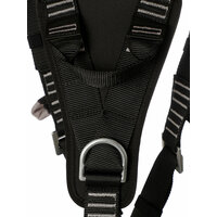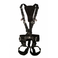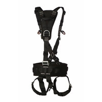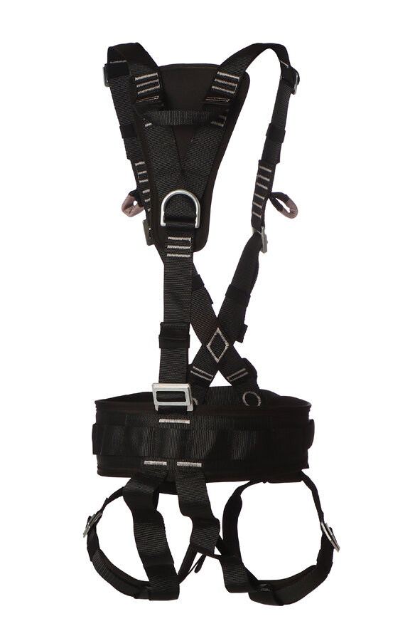 Точки крепления страховочной веревки: заниженная поясная, регулируемая по высоте грудная и дополнительная точка на спине. Быстрозатягивающиеся разъемные регулировочные пряжки. Широкие накладки на поясных и ножных ремнях для большего комфорта. Эвакуационная ручка на спине.