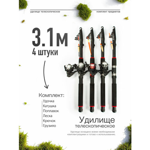 Удочка (удилище) - удобная и компактная для ловли на всех видах водоемов. Полностью готова к рыбалке! Удилище оснащено всеми необходимыми комплектующими. В состав удочки входят: • удочка - 1 шт. • безынерционная катушка SY200X - 1 шт. • поплавок - 1 шт • крючок - 1 шт. • грузило - 1 шт. Длина удочки в сложенном виде - 64 см. (легко поместится в небольшой рюкзак) Оптимальный размер 3,1 метра для начинающего и опытного рыболова. Удилище выполнено из биопластика повышенной прочности. Легкое и удобно лежащее в руке. Кольца с керамическими вставками сохраняют леску от перетирания и обеспечивают плавность изгиба. Удочка оснащена безынерционной катушкой. Комплект 4 шт. Внимание! Цвет катушки, форма и цвет поплавка может отличаться от представленного на фото! Отличная удочка для рыбалки, также будет незаменимым подарком для любого мужчины! Рыбачьте с удовольствием!