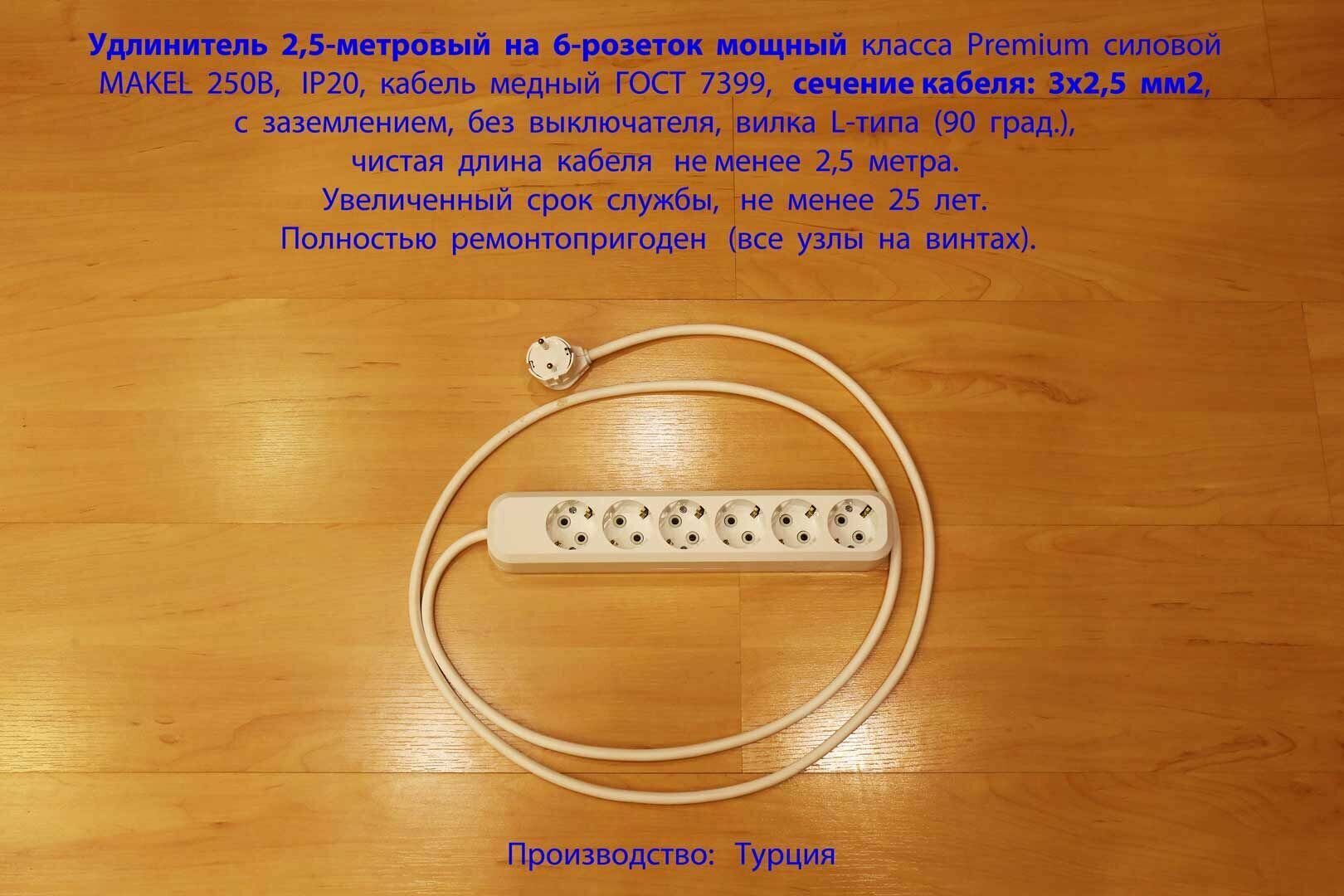 Купить Удлинитель 2,5-метровый электро силовой мощный MAKEL 250В на 6 розеток, сечение 3х2,5 мм2, белый, вилка угловая класса Premium с доставкой по всей России. Удлинитель 2,5-метровый электро силовой мощный MAKEL 250В на 6 розеток, сечение 3х2,5 мм2, белый, вилка угловая класса Premium: сравнение цен, характеристики, фото, актуальное наличие и цены.