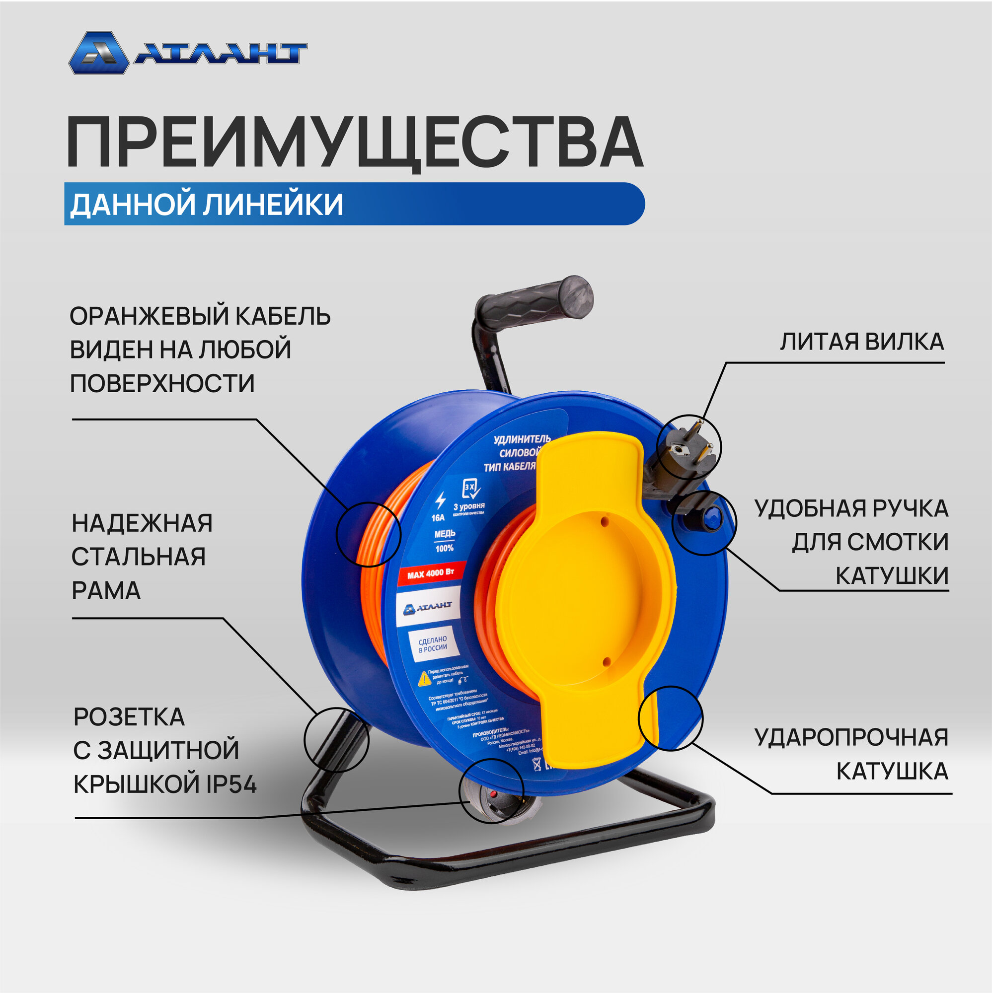 Купить Удлинитель 30 метров уличный, АТЛАНТ ПВС 2х2,5 на катушке 1 розетка IP54, садовый для газонокосилки, триммера с доставкой по всей России.