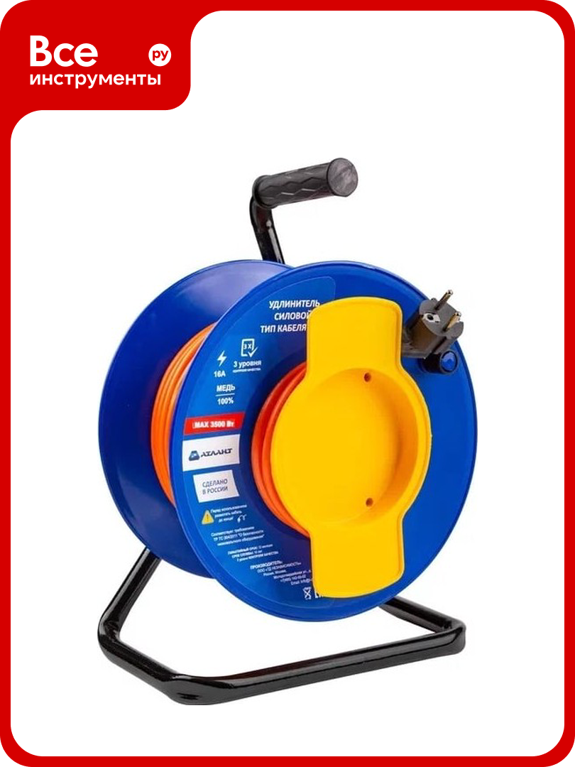 Удобная ручка для смотки катушки. Позволяет быстро наматывать или разматывать кабель, минимизируя временные затраты и Ваши усилия. Ему не страшны удары, падения и другие внешние механические воздействия;