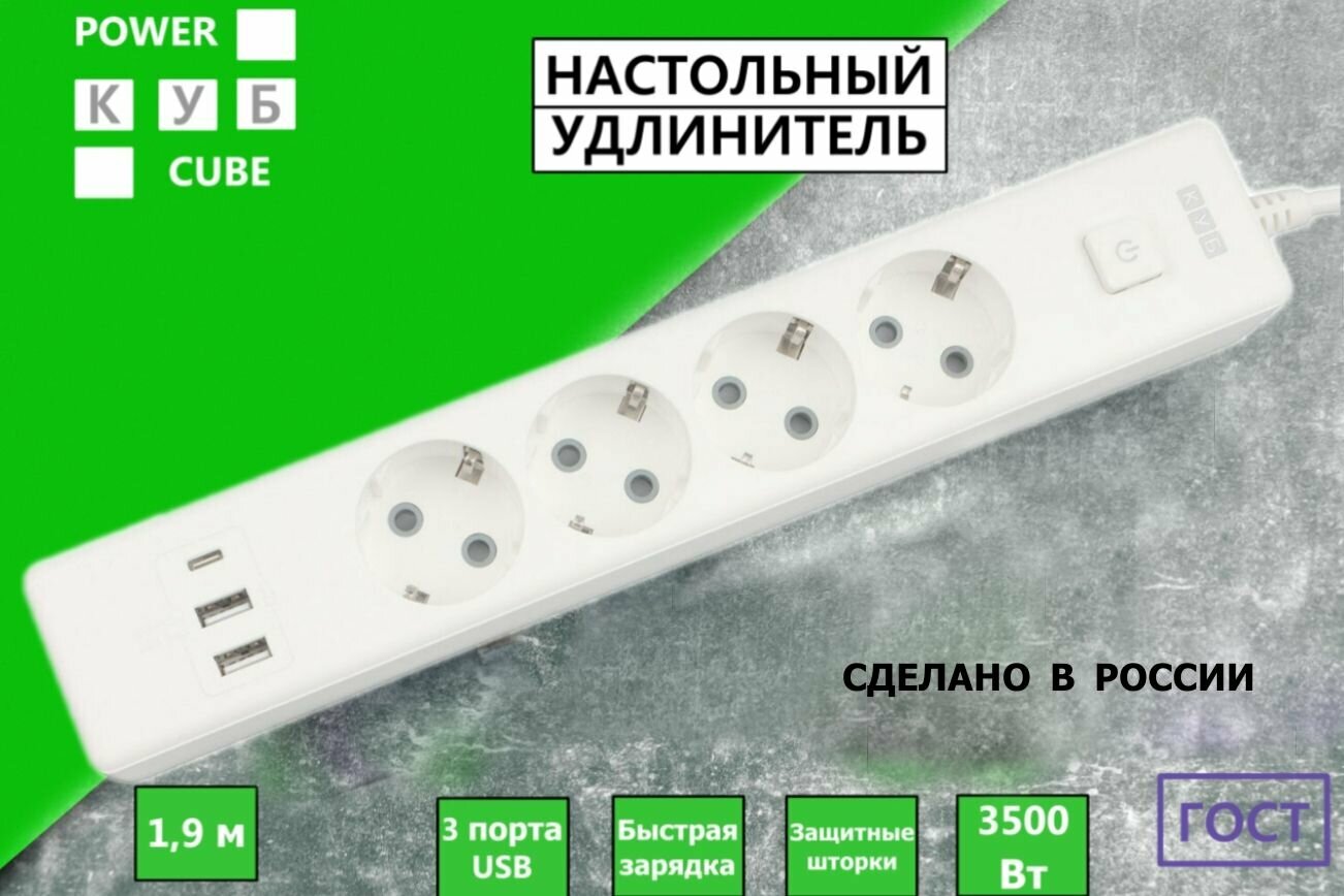 Купить Удлинитель электрический Power Cube 4р с/з вык,2USB-A, 1USB-Type-C, 3500 Вт, 16А,1.9 м PC-6-2M с доставкой по всей России.