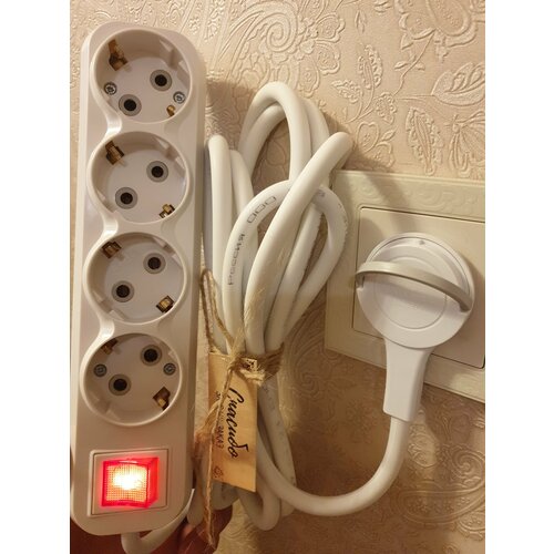 Удлинитель оснащен четырьмя розетками, что позволяет одновременно подключать несколько устройств. Длина кабеля составляет 3 метра, что обеспечивает достаточное расстояние для комфортного использования.