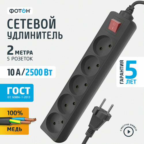 Купить Удлинитель ФОТОН 10-25S, 5 розеток, б/з, 10А / 2500 Вт 5 2 м 0.75 кв. мм 200 мм 100 мм 50 мм черный с доставкой по всей России. Удлинитель ФОТОН 10-25S, 5 розеток, б/з, 10А / 2500 Вт 5 2 м 0.75 кв. мм 200 мм 100 мм 50 мм черный: сравнение цен, характеристики, фото, актуальное наличие и цены.