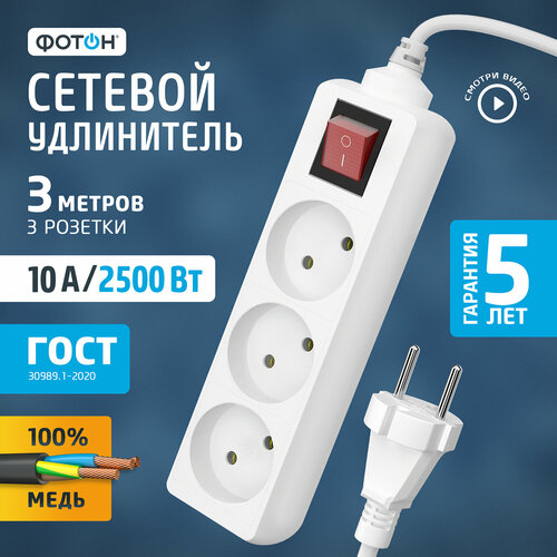 Купить Удлинитель ФОТОН 10-33S, 3 розетки, б/з, 10А / 2500 Вт 3 3 м 0.75 кв. мм 40 мм 120 мм 230 мм белый с доставкой по всей России. Удлинитель ФОТОН 10-33S, 3 розетки, б/з, 10А / 2500 Вт 3 3 м 0.75 кв. мм 40 мм 120 мм 230 мм белый: сравнение цен, характеристики, фото, актуальное наличие и цены.