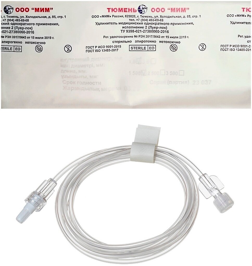 Удлинитель медицинский стерильный однократного применения, исполнение 2 (Луер-лок) ТУ 9398-021-27380060-2016 Внутренний диаметр 1,5 мм Длина 1500 мм В коробке 110 штук