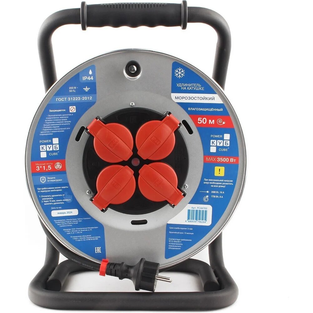 Удлинитель на металлической катушке Power Cube IP44, 16А, 50м, резина, 3×1,5мм2, 4 розетки с заземлением, PC44703: сравнение цен, характеристики, фото, актуальное наличие и цены.