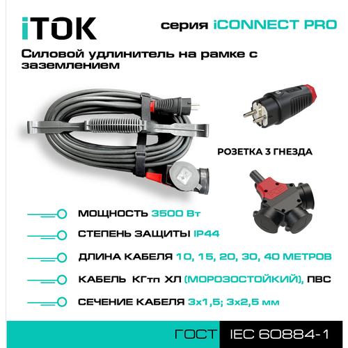 Удлинитель силовой уличный ПВС 3х1,5 мм 3 розетки IP44 20 м на рамке с заземлением серии iCONNECT PRO iTOK: сравнение цен, характеристики, фото, актуальное наличие и цены.