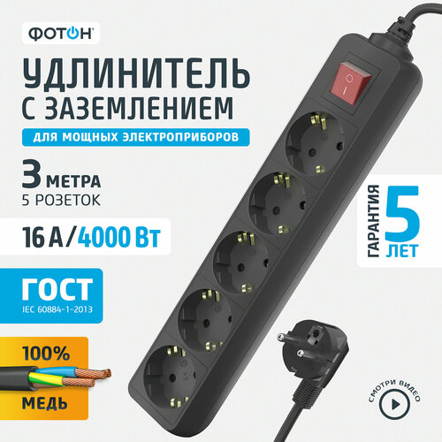 Купить Удлинитель сетевой для розетки фотон 16А 3м 5 розеток с выключателем с заземлением черный, ГОСТ с доставкой по всей России. Удлинитель сетевой для розетки фотон 16А 3м 5 розеток с выключателем с заземлением черный, ГОСТ: сравнение цен, характеристики, фото, актуальное наличие и цены.
