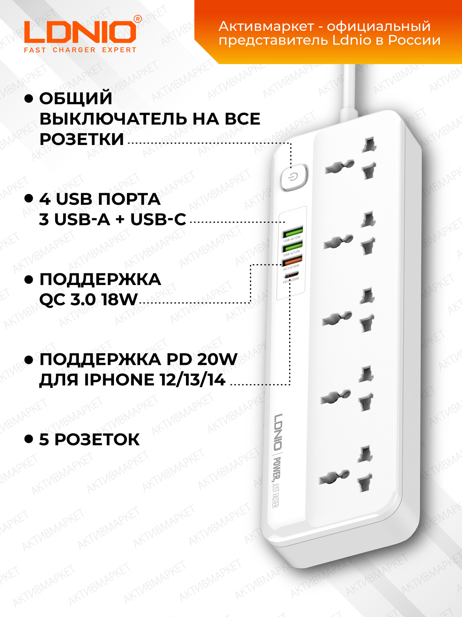 Сетевой фильтр LDNIO SC5415, 5 universal port + 1C PD + 1USB QC3.0 + 2USB Auto ID, Кабель 2 м, Белый: сравнение цен, характеристики, фото, актуальное наличие и цены.