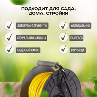Конструкция на катушке позволяет удобно хранить удлинитель и избегать запутывания проводов. Легкость намотки и размотки значительно упрощает процесс использования — вам больше не придется тратить время на распутывание сложных узлов. Удлинитель выполнен из высококачественных материалов, что гарантирует его долговечность и устойчивость к внешним воздействиям.