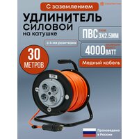 Изделие выполнено из прочных материалов, что гарантирует долгий срок службы, даже при интенсивном использовании. Удобная катушка позволяет эффективно управлять проводом, предотвращая его запутывание. Удлинитель оборудован тремя розетками, что значительно расширяет возможности подключения нескольких устройств одновременно.