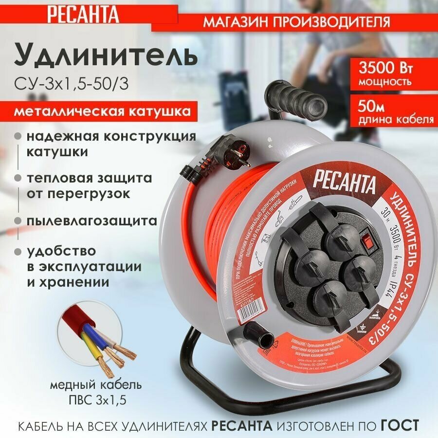 Купить Удлинитель Ресанта СУ-3х1,5-50/3, силовой, на катушке, с выкл, 4 розетки, IP44 с доставкой по всей России. Удлинитель Ресанта СУ-3х1,5-50/3, силовой, на катушке, с выкл, 4 розетки, IP44: сравнение цен, характеристики, фото, актуальное наличие и цены.
