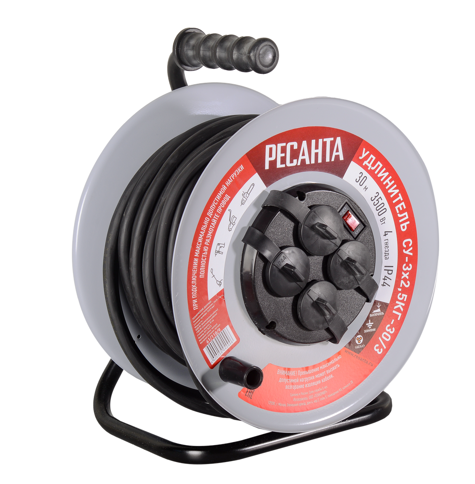 Удлинитель силовой на металлической катушке, СУ-3х2,5КГ-30/3 (с выкл, 4 розетки, IP44) Ресанта. Силовой удлинитель – это очень удобное устройство из кабеля, вилки и усиленной розетки, которое способно существенно облегчить условия работы в саду, при строительстве и ремонте. В отличие от бытовых моделей силовые удлинители используются для подключения к сети мощных электроприборов (до 3,5 кВт), находящихся далеко от источника питания. При подключении максимально допустимой нагрузки полностью разматывайте провод! Преимущества: удобство в эксплуатации и хранении; надежная конструкция катушки; пылевлагозащита; тепловая защита от перегрузок; кабель с повышенными промышленными требованиями, морозо и жаростойкий.