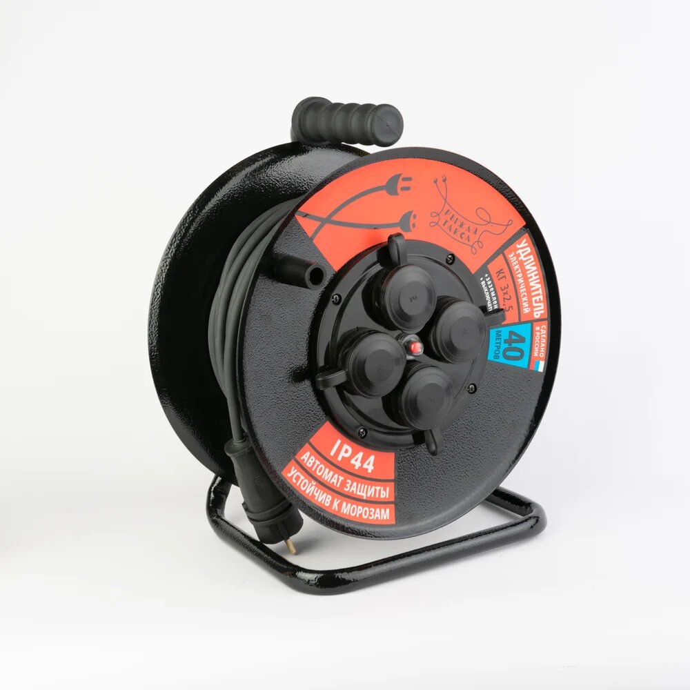 Удлинитель силовой рыжая такса УКМ4404-3735 на металлической катушке с проводом КГ-ХЛ 3*2,5 обеспечивает надёжное и безопасное подключение электроприборов на расстоянии до 40 метров от стационарного источника питания. Модель имеет 4 розетки с защитными крышками, что позволяет одновременно подключать несколько устройств, суммарная мощность которых не превышает 3500 Вт.