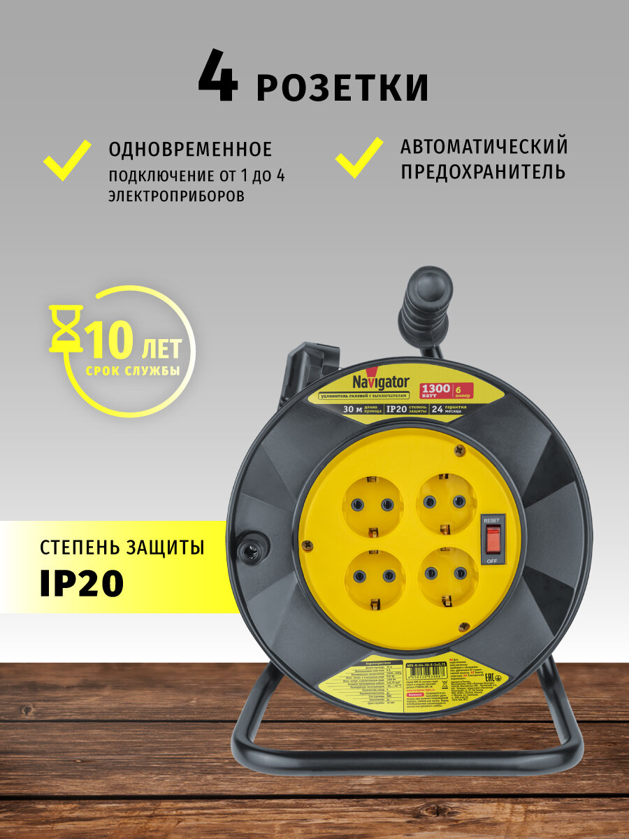 Удлинитель силовой на пластиковой катушке Navigator 93 906 NPE-R с выключателем, 4 розетки, с зазем, 30м, IP20: сравнение цен, характеристики, фото, актуальное наличие и цены.