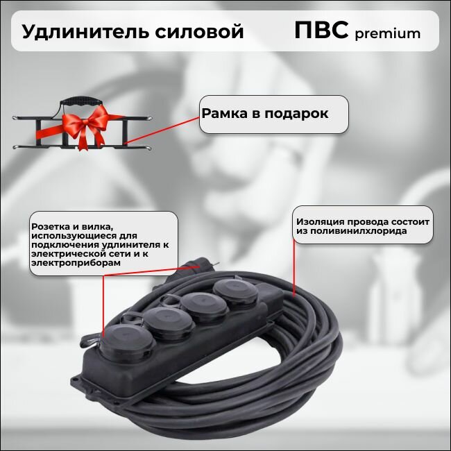 Купить Удлинитель силовой «PREMIUM CABLE» с 4 розетками на рамке, электрический 10 м кабель ПВС 2х1 черный ГОСТ с доставкой по всей России.
