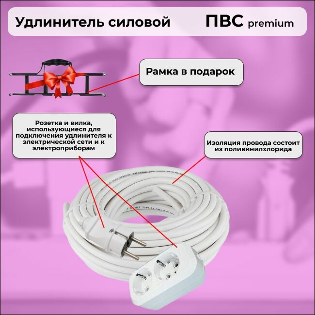 Удлинитель силовой «PREMIUM CABLE» кабель ПВС 3х1 белый, с 2-ой розеткой на рамке, электрический 10 м с заземлением: сравнение цен, характеристики, фото, актуальное наличие и цены.